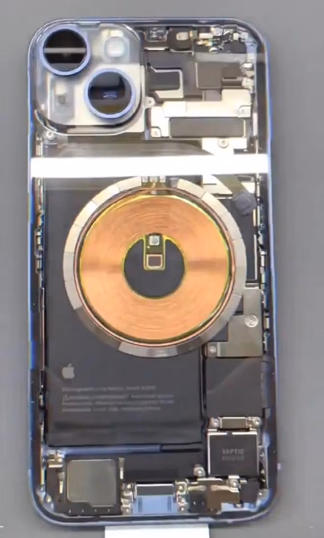 Trên Twitter, một số tài khoản chia sẻ hình ảnh iPhone 14 màu xanh dương được "độ" mặt lưng trong suốt, giúp nhìn thấy các linh kiện như pin, nam châm MagSafe, bộ rung Taptic Engine, cổng Lightning và một số bộ phận khác. Cụm camera trên góc cũng được làm trong suốt với lớp phủ mờ.