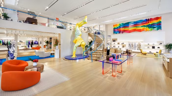 Bên cạnh các món đồ cao cấp được nhiều tín đồ săn đón, một điểm phải kể đến nữa của cửa hàng này là không gian đầy nghệ thuật. Trong cửa hàng có tác phẩm điêu khắc “Người khổng lồ” do chính tay Abloh thiết kế, cùng các bức tranh treo tường của Alex Proba, bên cạnh tác phẩm tranh acrylic ba chiều trên thép không gỉ và gương của nghệ sĩ Marisa Ferreira.