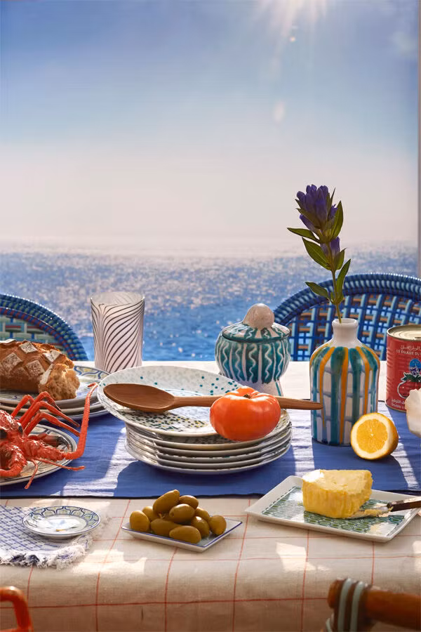Lấy cảm hứng từ thần thoại, một chiếc đĩa và bình tráng men gợi lên thời kỳ vàng son của Vallauris cũng giống như những bức tranh sơn dầu của Matisse hoặc Cézanne. Nến thơm với ba vỏ bọc bằng da Ý ba màu (biển, thực vật và năng lượng mặt trời) để bọc nến. Những chiếc lọ và giá đựng tealight mới bằng thủy tinh Murano màu từ Stories of Italy và giá đỡ tealight bằng gốm do Cécile Bichon thiết kế và các đồ gốm khác của Sophie Irwin.