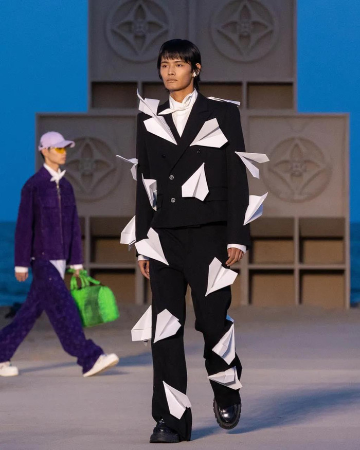 Những bộ vest cổ điển vẫn là lượt và sang trọng, tuy nhiên được nhấn nhá bằng những họa tiết 3D vui tươi, chẳng hạn như máy bay giấy trắng trên nền vải đen, hay phom dáng rộng phá cấu trúc của một chiếc áo vest dài. Cùng sự phối màu làm nổi bật vừa tính lịch lãm của một người đàn ông, vừa hé lộ sự dí dỏm tinh nghịch của một cậu bé.