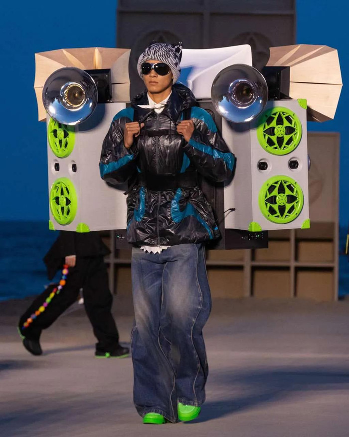 Louis Vuitton lấy cảm hứng từ phong cách đường phố những năm 1990, các đường cong và kích thước quá khổ được kết hợp với màu sắc tươi sáng cùng kiểu nhuộm màu nổi bật khiến các bộ trang phục bừng lên sức sống. Tính công nghệ của tương lai được thể hiện qua những chiếc ba lô tích hợp loa.