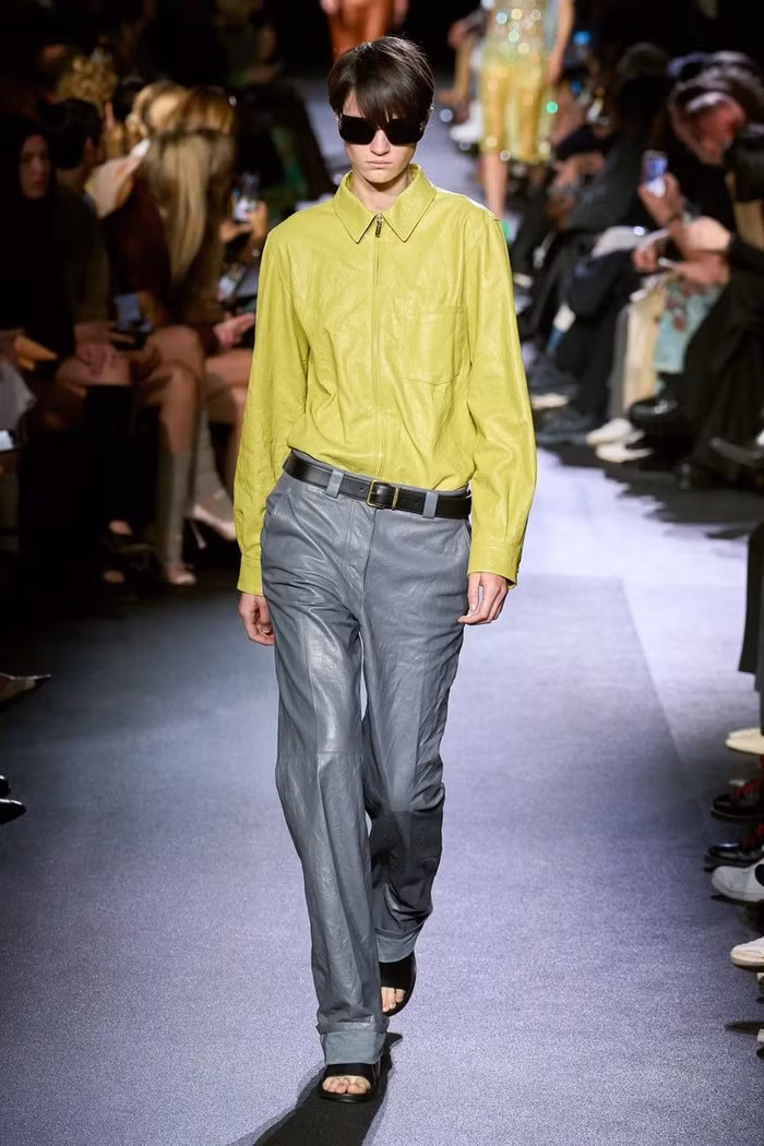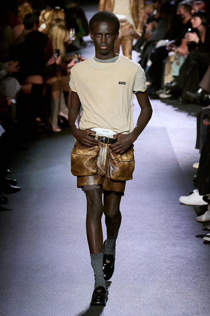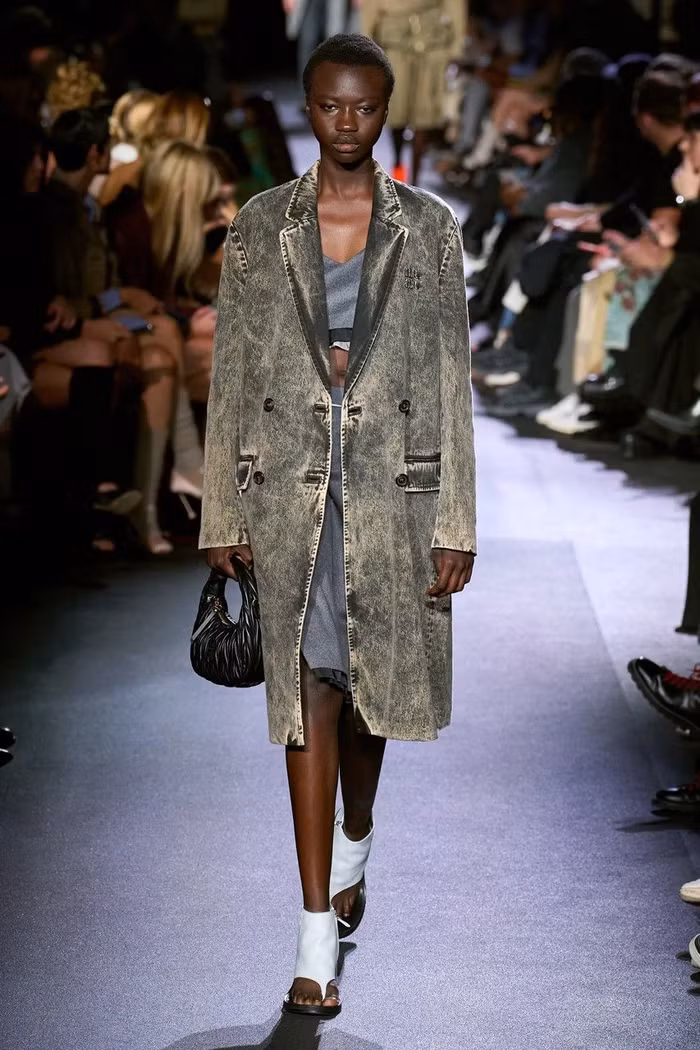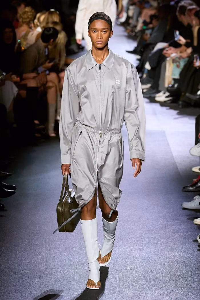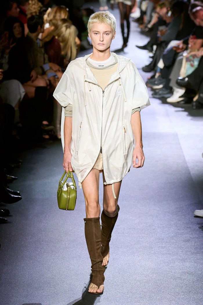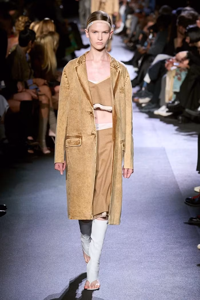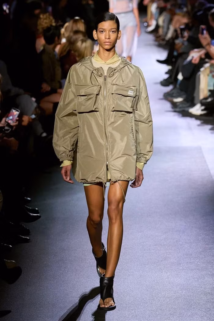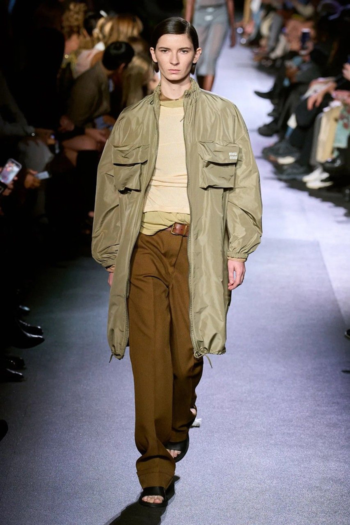 Làm nổi bật cả những món đồ may sẵn dành cho nam và nữ, buổi giới thiệu BST Miu Miu Xuân Hè 2023 đã xóa một khoảng trống cho mùa tới, có thể hiện rất nhiều màu sắc trung tính bao gồm màu be, nâu, xám và kaki . Tông màu đất xuất hiện dưới dạng phông chữ cotton xếp lớp bất đối xứng, quần vải kỹ thuật và áo khoác dài, sơ đồ và dép rãnh mũi.