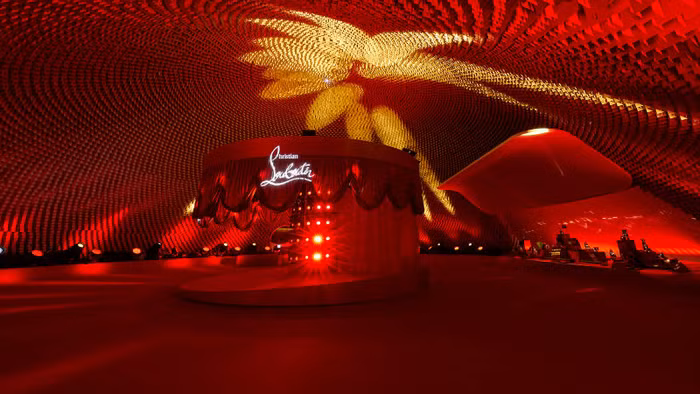 Một sân khấu hình tròn ở trung tâm của khuôn viên sự kiện, được bao phủ bởi những tấm rèm màu bạc trong suốt, nâng lên từ mặt đất với những tác động của ánh sáng và phản chiếu làm tăng thêm khung cảnh trắng hoàn toàn chính là ý tưởng chính của thiết kế kiến trúc này. Bên cạnh đó, bao phủ xung quanh là những ghế hình trụ tương thích với sàn màu đỏ, màu mang tính di sản của Christian Louboutin.