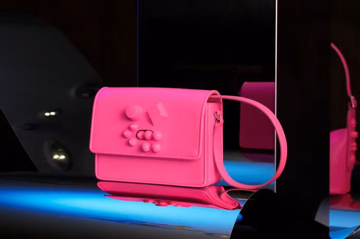 Lối đi dạo dẫn đến hai khu vực kế bên làm nổi bật các chủ đề chính của BST Thu Đông: thiết kế sản phẩm Greekaba và các phiên bản mới của túi Maison’s Carasky.