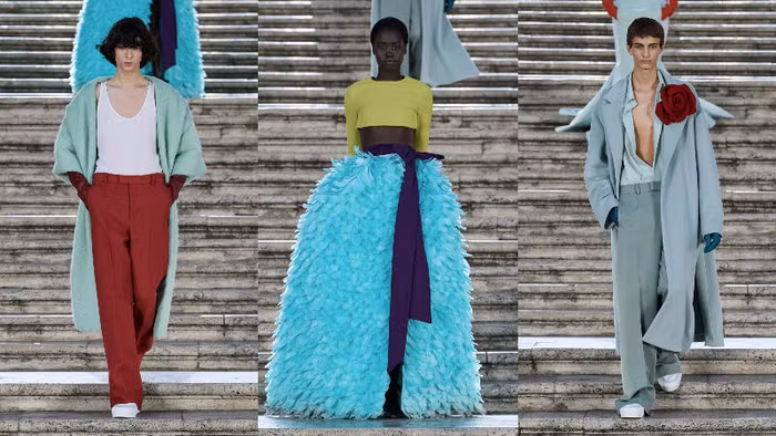 Hơn 100 thiết kế trang phục trong BST này thể hiện tầm nhìn ở hiện tại và tương lai của Pierpaolo Piccioli tại nhà mốt Valentino. Vẫn là các phối màu color-block nịnh mắt nhưng được nâng lên một tầm cao mới với kỹ thuật xử lý chất liệu vải mô phổng những đóa hoa hồng nở rộ rực rỡ, chi tiết nơ điệu đà, lông vũ điểm xuyết cho vẻ đẹp duyên dáng và sang trọng của người phụ nữ. Không chỉ tạo nên sức hút đầy mê hoặc trên các thiết kế dành cho nữ, Haute Couture dành cho nam giới được Pierpaolo cũng không kém phần chỉn chu, thời thượng từ những bản phối monochrome cho đến color-block vô cùng tinh tế.