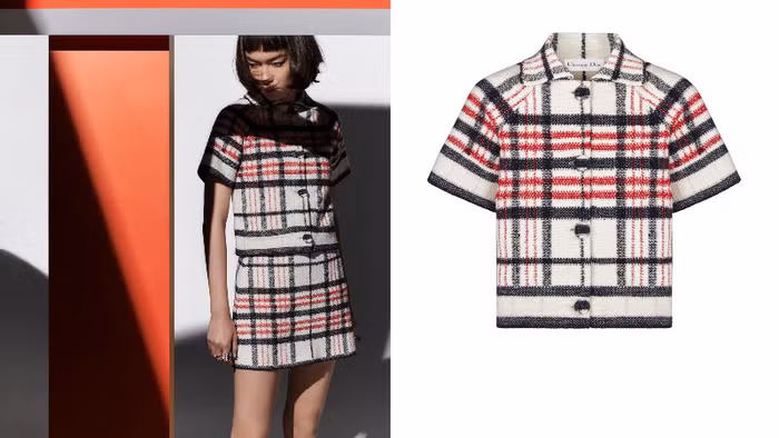 Không dừng lại ở đó, BST Dior Xuân Hè 2022 còn khiến giới mộ điệu xuýt xoa trước thiết kế áo khoác họa tiết tartan mới của NTK Maria Grazia Chiuri. Lấy cảm hứng từ thời trang những năm 1960 và các thiết kế lưu trữ của Marc Bohan, chiếc áo dáng lửng được dệt nên từ cotton và len bằng kỹ thuật đặc biệt có tên gọi là “inlay” (dệt lồng). Theo đó, những sợi vải mịn được đan làm gốc, sau đó đan tiếp các sợi vải dày hơn lên trên. Đó là cách để tạo nên các motif tartan của áo. Ngoài ra, phần chữ ở mặt sau chiếc áo được đan bằng kỹ thuật jacquard mang màu sắc tối giản vô cùng thanh lịch.