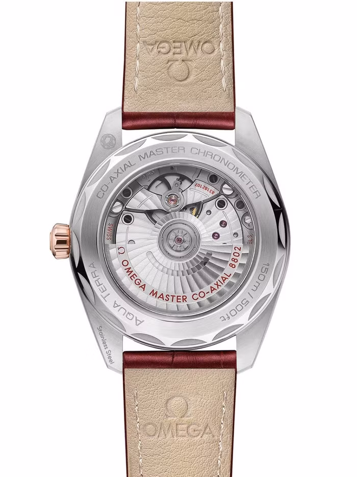 Mặt dưới trong suốt để lộ bộ máy OMEGA Co-Axial Master Chronometer 8802
