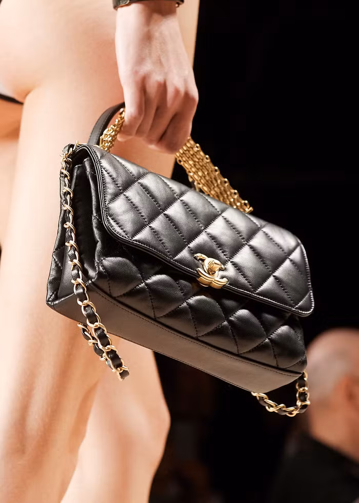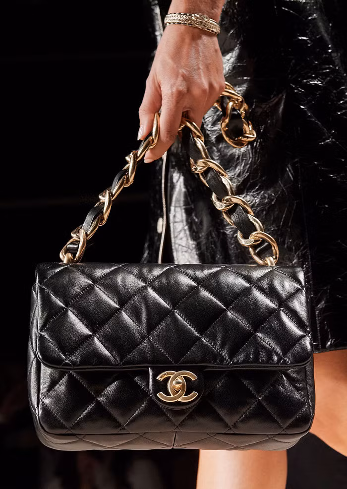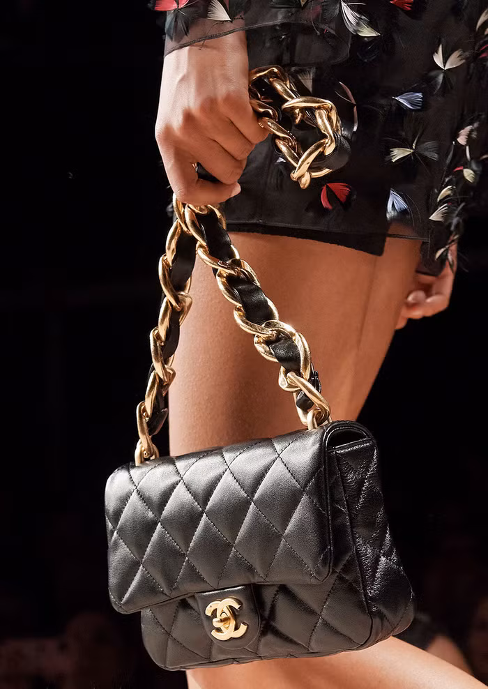 Vài mẫu túi được biến tấu với quai mắt xích to “khủng”. Biên độ phóng to của quai cầm túi tạo cảm giác trẻ trung cho các mẫu thiết kế. Trong vòng 1-2 năm đổ lại, các thương hiệu trẻ hóa khi thêm thắt nhiều phụ tùng (hardware) to bản hầm hố cho thời trang và phụ kiện, lấy cảm hứng từ văn hóa âm nhạc hip hop hay thời trang đường phố (streetwear). Có thể thấy Chanel cũng không ngoại lệ.