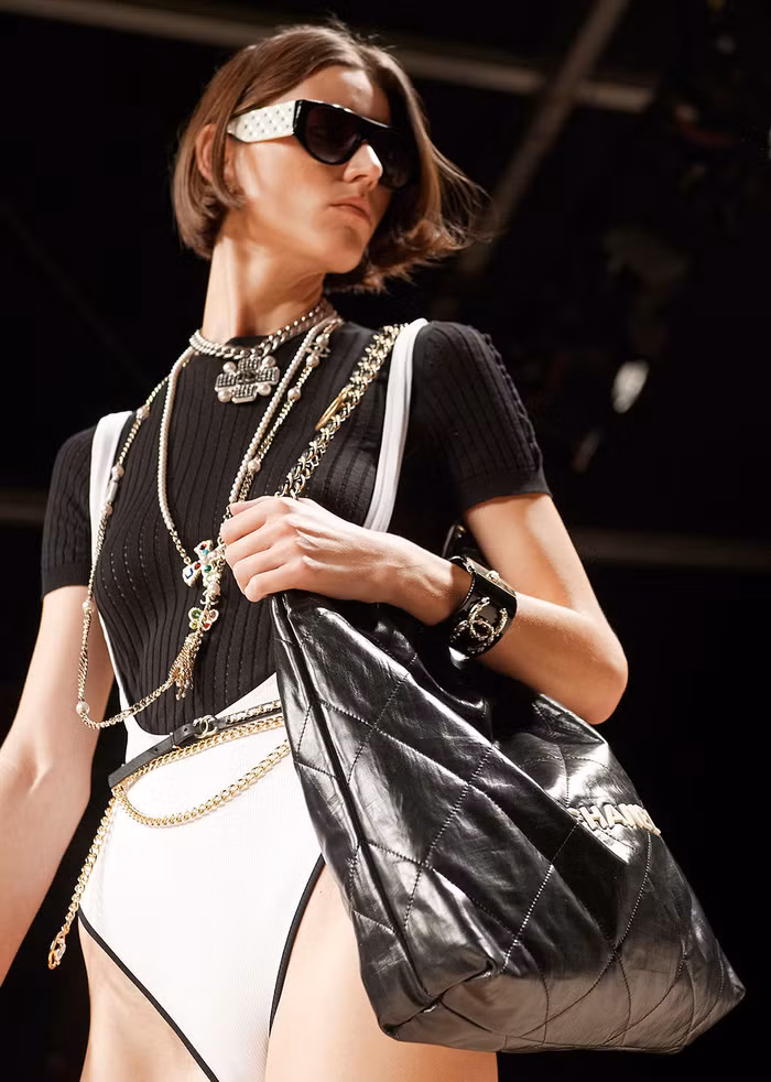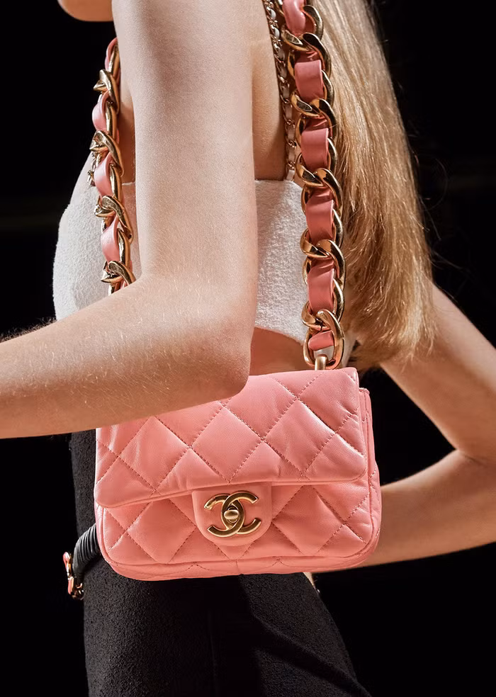 Fan thương hiệu Pháp nhận biết thiết kế túi xách Chanel qua quai cầm mắt xích được đan với dải da thuộc. Cho mùa Xuân Hè 2022, Chanel đã phóng tay sáng tạo với phần quai cầm này.