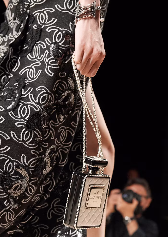 Xuất hiện trên sàn diễn Chanel là mỹ phẩm của thương hiệu Pháp. Tất nhiên, không phải người mẫu vừa đi vừa cầm mỹ phẩm Chanel trang điểm. Mà chiếc túi trong tay của họ mô phỏng như thật các mỹ phẩm của nhà mốt Pháp. Có thể kể đến các mẫu túi minaudière trông như chai nước hoa Chanel No.5. Hay chiếc túi mô phỏng chiếc hộp phấn màu đen của hãng.