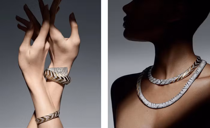 Với lớp vảy ca rô bằng vàng và bạch kim, những viên ngọc của dòng Radiance tự cho mình thấy như một chiếc áo giáp bảo vệ thực sự, bao bọc quanh cơ thể như một lớp da thứ hai. Một món trang sức được chiếu xạ bởi viên đá garnet màu cam sáng 10,99 carat ở chính giữa vòng cổ, phần trung tâm.