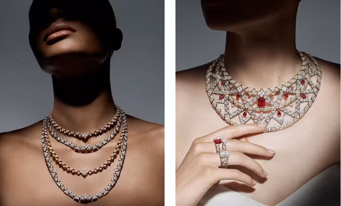 Không thể bỏ qua chiếc vòng cổ kim cương có cánh và viên ngọc thạch XXL 65,26 carat đến từ Đông Phi. Hai cánh phượng hoàng quấn quanh cổ, thể hiện sự tái sinh, bay, khám phá tầm cao mới và vượt qua bản thân với tác phẩm này đòi hỏi hơn 2.000 giờ chế tạo.