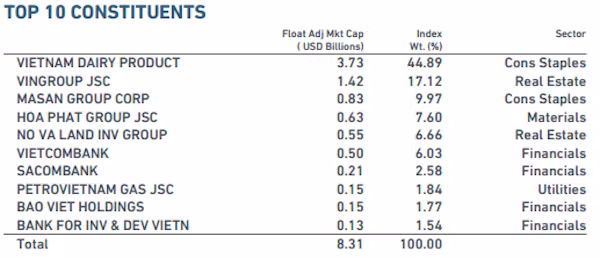 Tính đến ngày 31/10/2017, danh mục MSCI Vietnam Index bao gồm 10 cổ phiếu VIC, MSN, VCB, HPG, STB, GAS, BVH, BID, VNM và NVL. MSCI Vietnam Index là chỉ số bao gồm 10 cổ phiếu thành phần và đại diện cho khoảng 85% vốn hóa được MSCI xây dựng nhằm đo lường diễn biến của các cổ phiếu vốn hóa vừa và lớn trên thị trường chứng khoán Việt Nam.