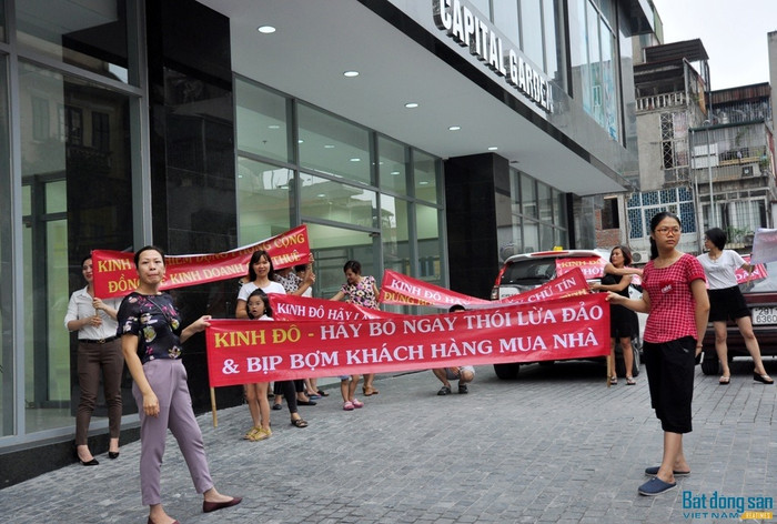 Trong đó, có cả trẻ nhỏ, phụ nữ cũng cầm băng rôn, biểu ngữ với nội dung: Kinh Đô coi thường tính mạng của hàng nghìn cư dân; Kinh Đô hãy bỏ ngay thói lừa đảo & bịp bợm khách hàng mua nhà; Kinh Đô bàn giao nhà khi hệ thống PCCC chưa được nghiệm thu…