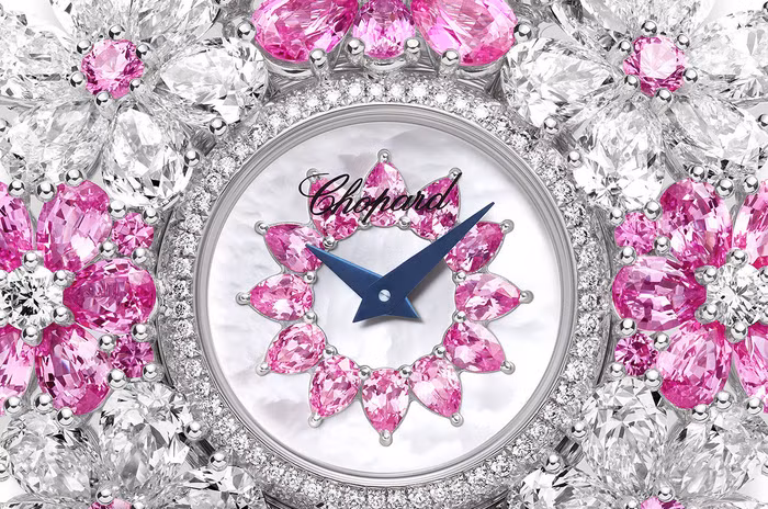Cụ thể, đồng hồ Flower Power của Chopard được trang trí bằng những viên đá saphire fancy hồng có giác cắt hình quả lê (28,02 carat) và cắt tròn (3,29 carat). Kim cương cắt tròn hoàn hảo (2 carat) tạo hình thành những vòng hoa tinh tế. Cùng với đó là kim cương giác cắt hình quả lê 42,58 carat. Tổng khối lượng kim cương được nạm là 76 carat.
