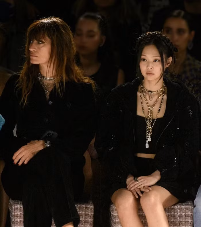 Jennie trên hàng ghế đầu show diễn giới thiệu bộ sưu tập Thu – Đông 2022 của Chanel. Bên cạnh nữ idol là biểu tượng thời trang người Pháp Caroline de Maigret – quý cô đa tài và cũng là một trong những đại sứ toàn cầu của thương hiệu. Cả hai đã có khoảng thời gian chuyện trò vui vẻ bên thềm sự kiện. Trước đó, Caroline và Jennie cũng từng có buổi trò chuyện trực tuyến sau show diễn Thu – Đông 2021 của Chanel.