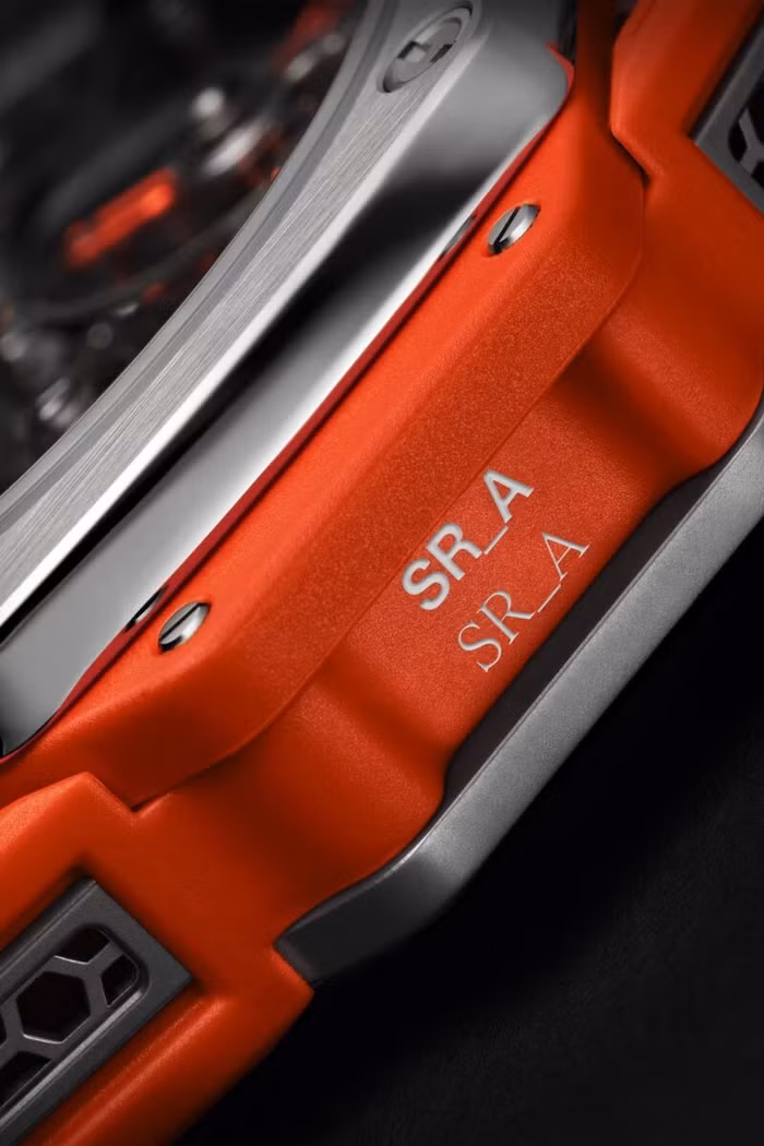 Tiếp đó là việc ứng dụng màu sắc đặc trưng của Ross. Tựa như đại diện của năng lượng và sự lạc quan, màu cam tươi được sử dụng trên dây đeo, các điểm nhấn trên vương miện, cầu tourbillon và các thanh cản bên hông để bảo vệ vỏ máy. Màu cam đậm cung cấp một điểm tương phản sống động, đối nghịch với màu xám u ám hơn của vỏ và bezel hoàn thiện bằng sa tanh.