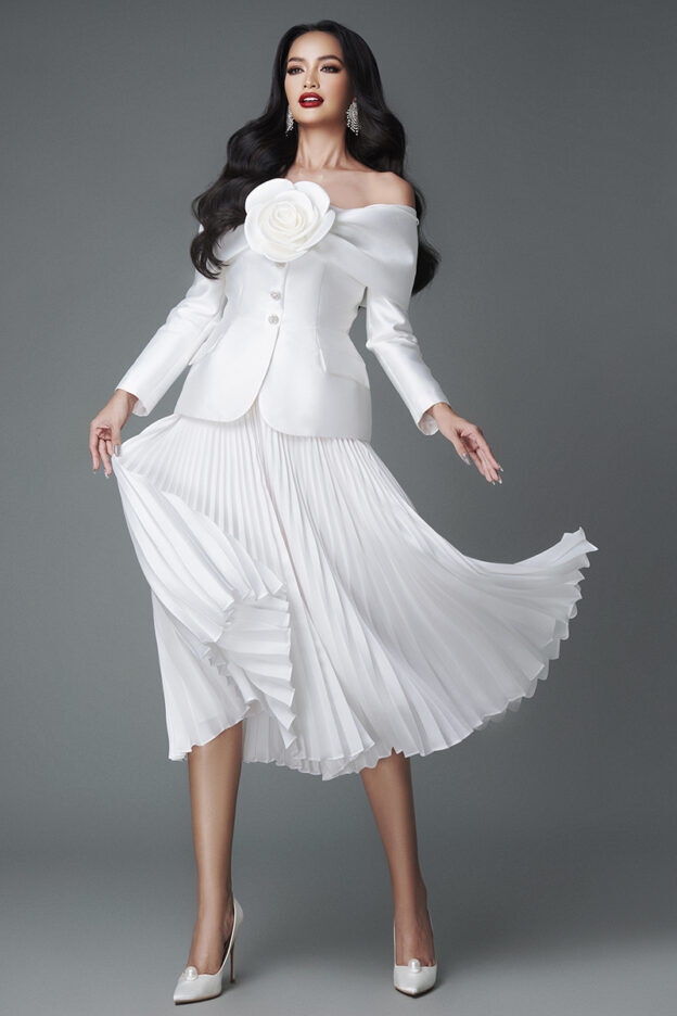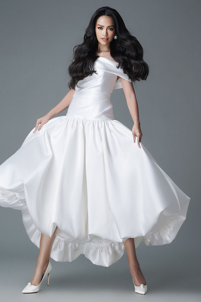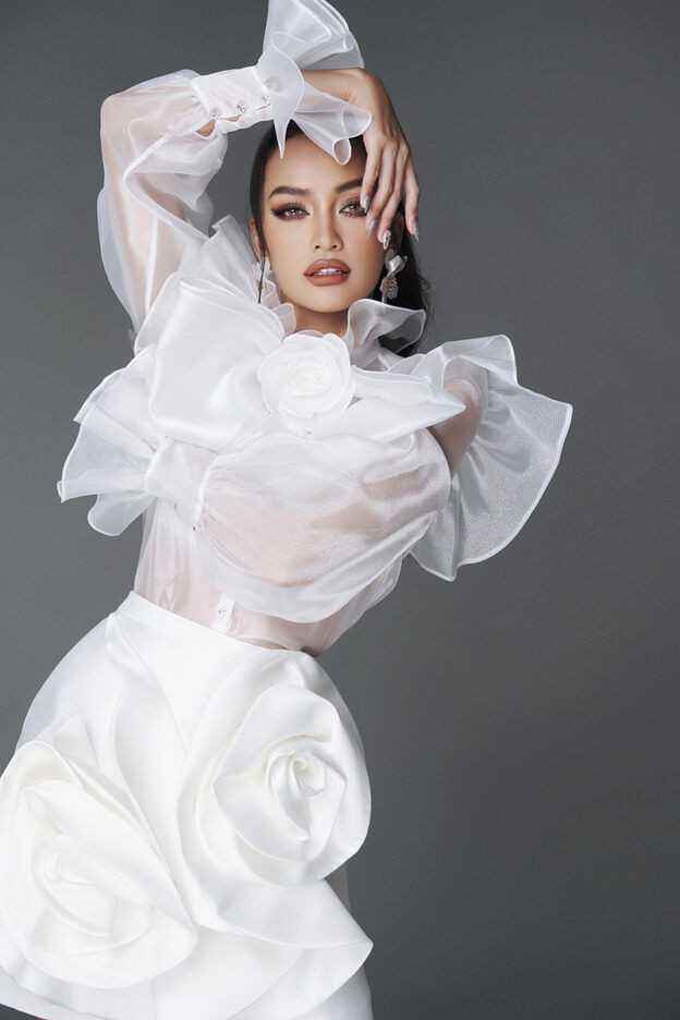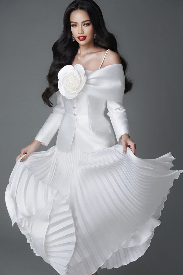 Cũng trên nền lụa, NTK Đỗ Mạnh Cường kết hợp nhiều tầng chất liệu nên áo điệu đà, nữ tính. Trang phục mềm mại, càng tôn lên vẻ đẹp nữ tính, thanh lịch. Hoa hậu hoàn vũ Việt Nam 2022 chọn hoa hậu tiết kiệm hoa để phân phối cùng.
