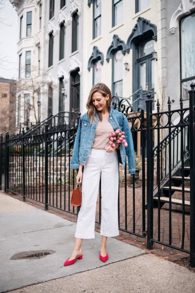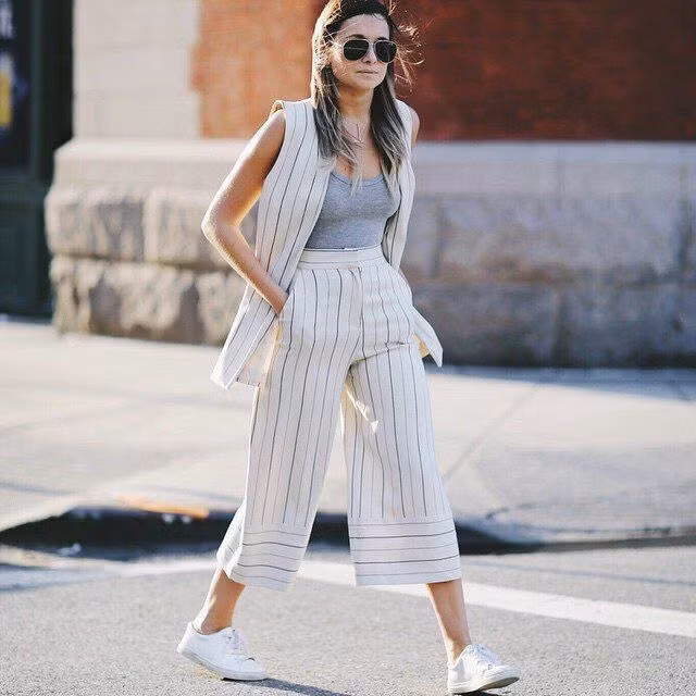 Bạn không cần phải leo lên đôi giày cao gót mọi lúc khi diện quần ống rộng. Thay vào đó, hãy thử một đôi giày sneakers trắng hoặc có màu sắc trẻ trung, chẳng hạn như đôi Adidas Stan Smiths hoặc Converse năng động.