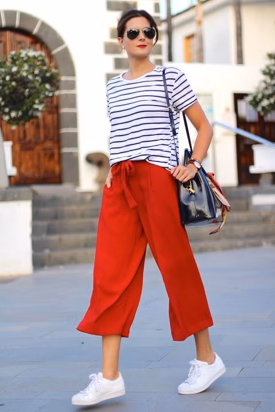 Nếu bạn vẫn chưa hoàn toàn tin tưởng vào kiểu dáng đặc biệt của chiếc quần culottes và vẫn muốn một chút thử thách, bạn có thể thêm điểm nhấn bằng màu sắc sặc sỡ của những item thời trang đi kèm chẳng hạn như giày cao gót, áo in họa tiết hoặc áo khoác màu neon.