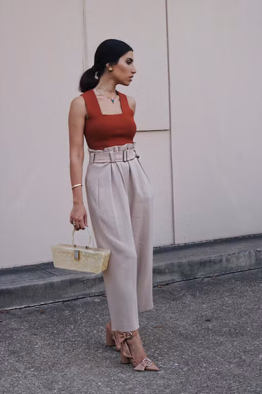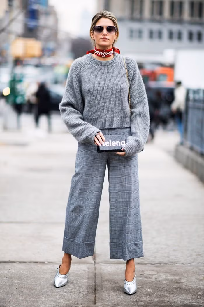 Một điểm chung thường thấy là các tín đồ thời trang thường chọn những dáng áo gọn gàng như áo không tay hoặc croptop để cân bằng lại sự thùng thình của kiểu quần ống rộng này.