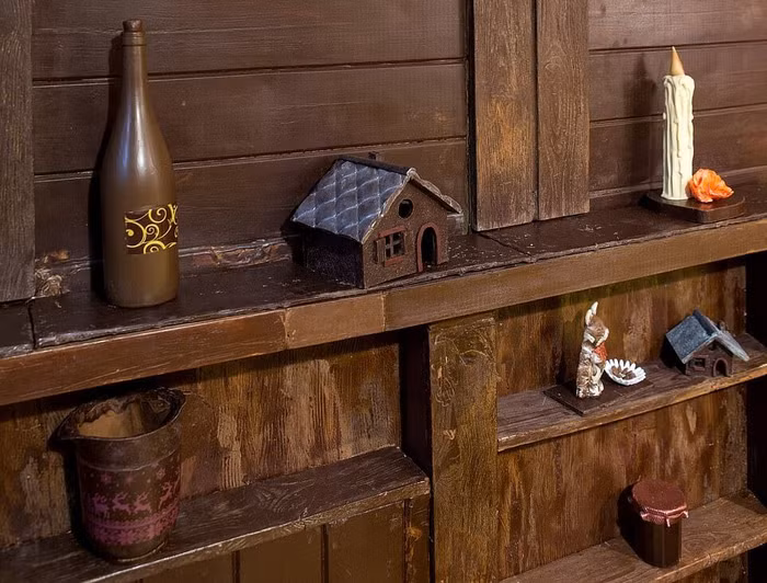 Những bức tường, mái nhà và lò sưởi đều được làm từ chocolate. Thêm cả những đồ vật lạ kỳ như đồng hồ, ly, sách hay thậm chí có cả đèn chùm chocolate.