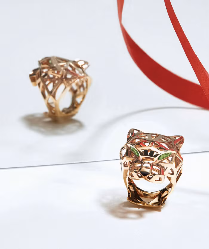 Báo gấm (Panthère), linh vật của Cartier xuất hiện lần đầu tiên trên chiếc đồng hồ đeo tay của nhà mốt vào năm 1914. Hình ảnh báo gấm tượng trưng cho sự tự do, táo bạo nhưng cũng đầy thanh lịch. Nhẫn Panthère de Cartier (hai chiếc phía trên) làm bằng vàng hồng 18K, đá onyx và đá tsavorite gắn ở mắt. Nhẫn Panthère de Cartier (phía dưới cùng) làm bằng vàng hồng 18K, đá onyx, sơn mài đen, kim cương và đá tsavorite gắn ở mắt.