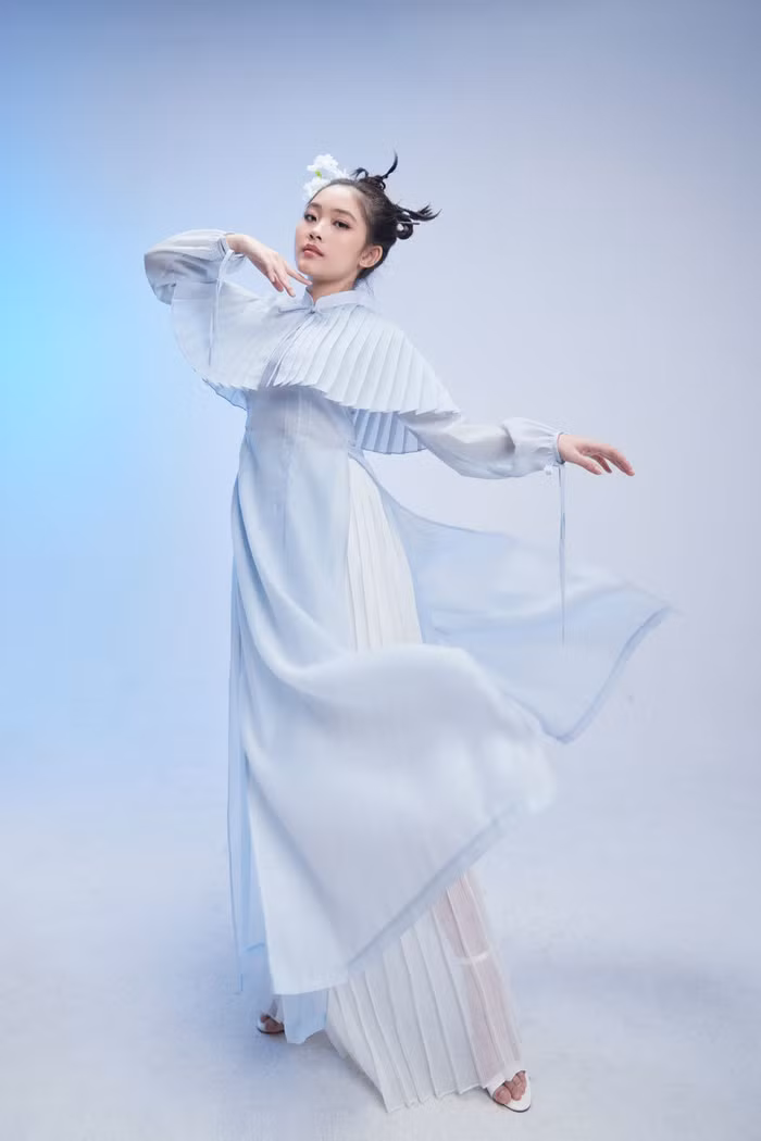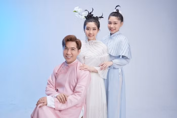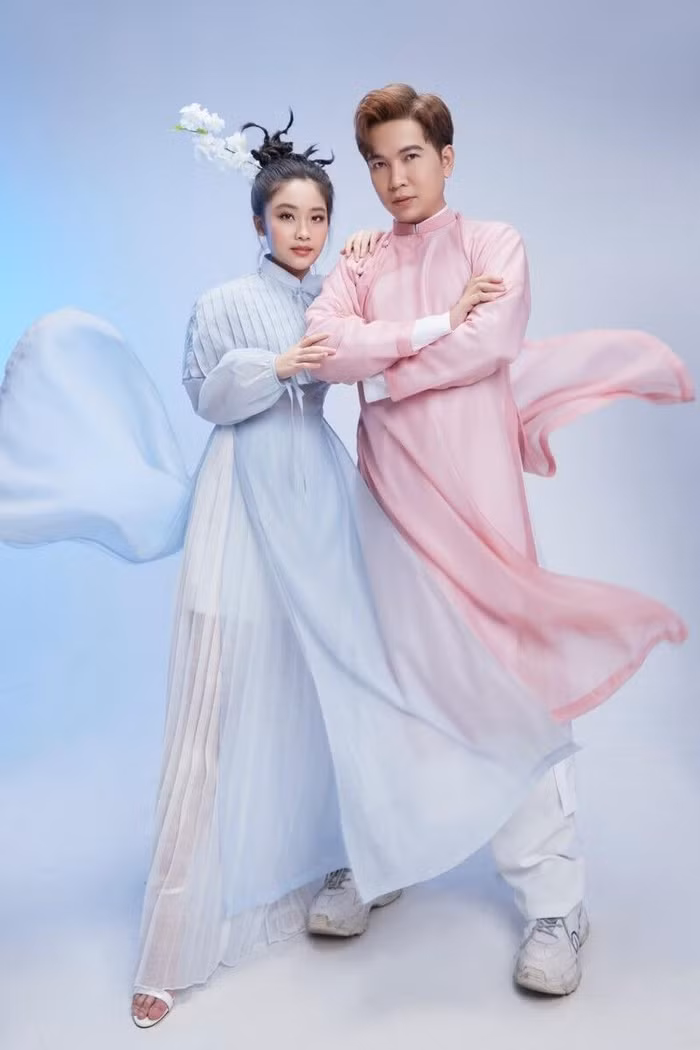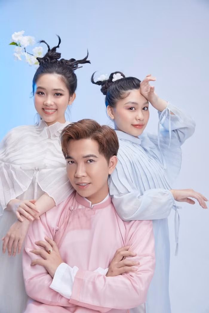 Áo dài lụa được trang trí thêm phần choàng vai xếp ly, tay lửng thắt nơ mang đến sự độc đáo, bắt mắt so với truyền thống. Để tạo sức hút cho bộ ảnh, NTK Ivan Trần còn kỳ công tạo kiểu tóc mới lạ cho 2 chân dài nhí. Đặc biệt, bộ ảnh thời trang lần này cũng có sự góp mặt của NTK Ivan Trần trong trang phục áo dài ngũ thân. Nam nhà mốt cho thấy sự trẻ trung, tinh nghịch của mình khi tạo những kiểu dáng, biểu cảm “khó đỡ” khiến cả ê-kíp đều phải phì cười.