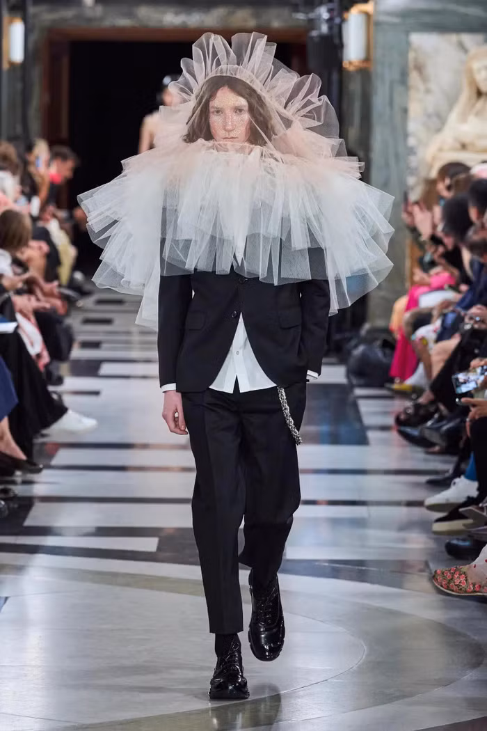 Tính nam xuyên suốt BST, theo như NTK Simone Rocha là trạng thái bảo vệ và chữa lành. “Có rất nhiều dây đai như thể đang trói buộc cảm xúc của mình lại, cảm giác gần giống như thuốc chữa lành vậy!” Mặc dù là menswear, nhưng tính nam trong thiết kế của NTK Simone Rocha vẫn được lấy cảm hứng từ những câu chuyện cổ tích, ví dụ như áo tuxedo bằng vải taffeta tay phồng, ngọc trai được đính kết tinh tế trên cổ áo nam, áo sơ mi kết hợp vải tulle xếp lớp. Ngược lại, thiết kế dành cho nữ lại thiên về cảm xúc tối tăm, huyền bí hơn. Đó là cảm giác trở về thực tại sau câu chuyện cổ tích đầy ma mị và chủ nghĩa thoát ly của mùa mốt trước – u ám với mạng che mặt đen, lấy cảm hứng từ truyền thống người dân Aran.