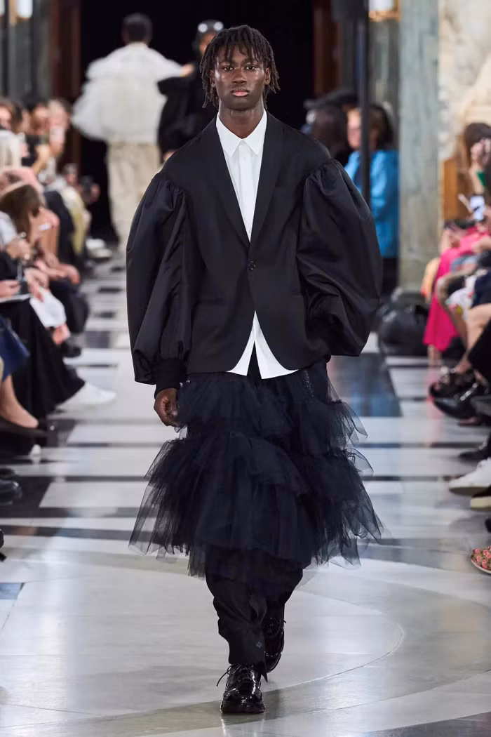 Như vậy, điểm giao thoa giữa tính nam và tính nữ nằm ở đâu trong tư duy của NTK Simone Rocha người Ireland này? Chúng ta có những tấm vải tulle màu kem xếp chồng tạo nên hiệu ứng rũ hòa hợp cùng kiểu áo bomber quân đội, đem đến bản phối đối lập của hai thái cực mềm mại và mạnh mẽ. Tương tự, áo bomber khaki truyền thống phối cùng quần cargo nhún vải cho nam, áo bomber phiên bản phóng đại trở thành chiếc váy puffer của nữ, và tiếp tục là model nam trong bản phối áo thun trắng, áo yếm babydoll ngọc trai và quần trouser họa tiết hoa.