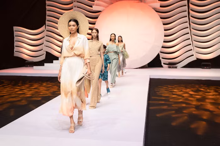 Với ba màn trình diễn, digital show “Mơ nhuộm nắng” lần lượt mô tả từng trạng thái sắc độ, cung bậc cảm xúc: từ sự hòa quyện từng khối màu đỏ sang cam rồi tím đầy mê hoặc của hoàng hôn, đến hoa đậu thơm bừng nở quyến rũ trên nền ombre biến chuyển nhiều sắc thái, cuối cùng là màn chờ đón bình minh ngày mới với nhiều gam màu nóng, tươi vui, rực rỡ của ánh nắng. Khắc hoạ giấc mơ của kẻ “Tuyên ngôn thời trang” được hiện thực hoá ở một phiên bản công nghệ tầm cỡ.