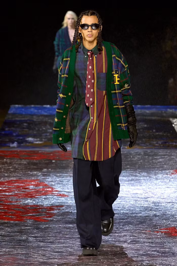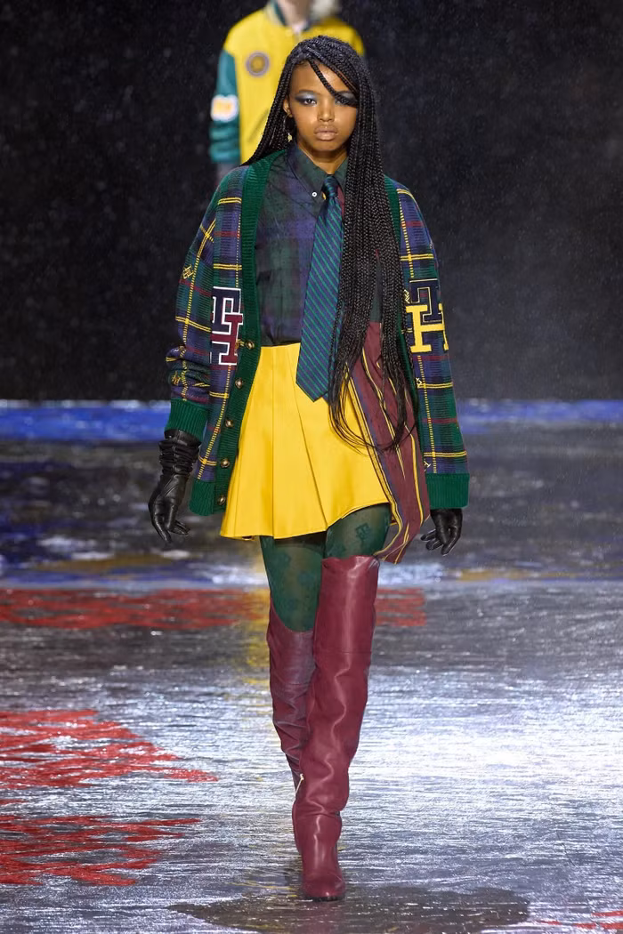 Vẫn mang âm hưởng từ bối cảnh khuôn viên trường học, preppy của Tommy Hilfiger lần này lại có phần năng động, nổi loạn và cá tính hơn. Varsity jacket với logo thêu góc trái trước ngực, áo polo kẻ sọc nhiều màu, quần baggy từ lớp vải chinos cực rộng, áo khoác tartan dệt kim, và còn cầu vai từ môn bóng bầu dục phổ biến,... Cứ như vậy, chúng ta đã có một khởi đầu đầy hoài niệm và ấn tượng. Khác với phiên bản có phần an toàn và thanh lịch từ những mùa mốt trước, lần này Tommy Hilfiger đã thực sự có bước chuyển mình, thay đổi ngoạn mục từ kiểu dáng đến styling nhiều tầng layer đậm chất thu đông.
