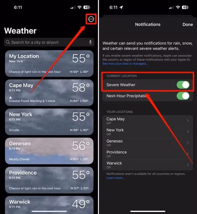 Ngoài khu vực hiện tại, người dùng Ứng dụng Thời tiết của iPhone cũng có thể tùy chỉnh nhận thông báo thiên tai cho bất kỳ thành phố nào mong muốn. Bên cạnh Severe Weather, một tùy chọn khác có tên Next-Hour Precipitation sẽ gửi cho người dùng Ứng dụng Thời tiết của iPhone thông báo nếu dự kiến sẽ có mưa hoặc ngừng mưa trong vòng một giờ tiếp theo.