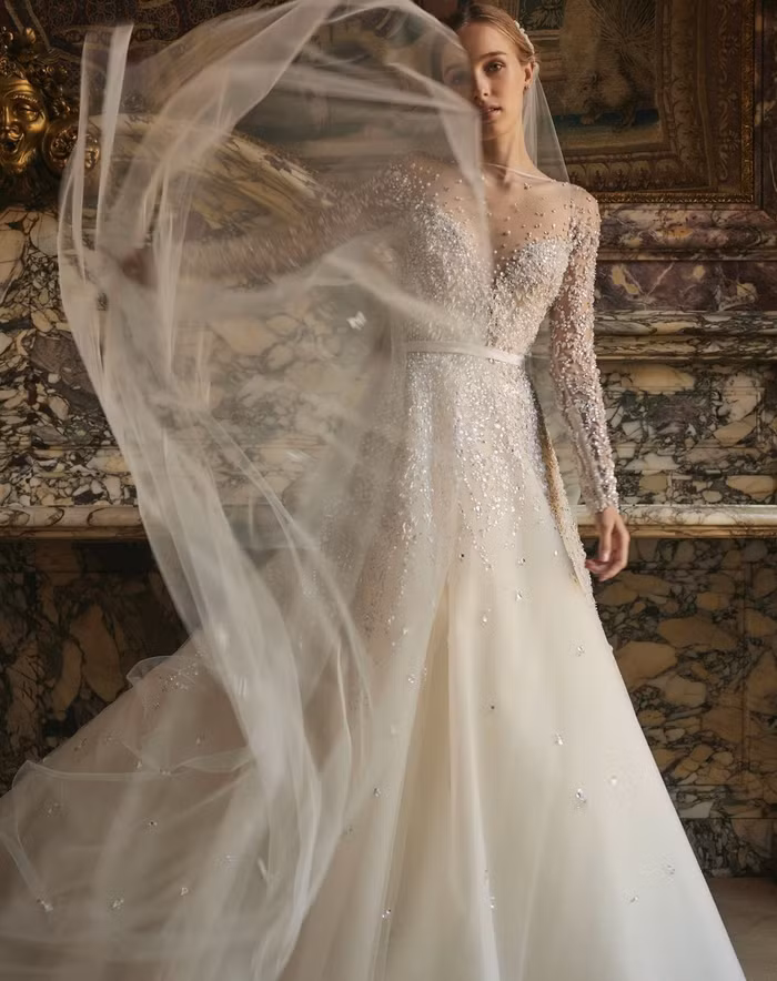 Trong đó, váy cưới thường có kiểu dáng ôm sát phần trên và xòe dáng chữ A hay ballgown, được nhấn ở ngực và eo, đồng thời được người thợ tài ba khéo léo vận dụng chất liệu và kỹ thuật thêu, nạm đá quý, đính sequin để tạo nên tác phẩm đỉnh cao. Nhờ đó, mỗi cô dâu xuất hiện nơi lễ đường trong chiếc váy cưới Elie Saab đều mang một vẻ đẹp tỏa sáng, tinh tế, quyến rũ và cả hơi thở Á Đông huyền bí.