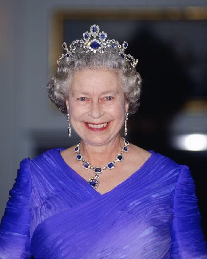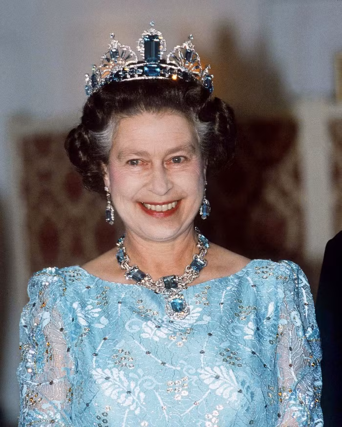 Bộ trang sức kim cương đá sapphire gồm có vòng cổ và hoa tai được đặt làm vào năm 1850 bởi Vua George VI cho cô con gái Lilibet nhân dịp đám cưới. Chiếc vương miện đồng bộ được thiết kế năm 1963 sau này. Trong bức hình dưới đây, Nữ hoàng Elizabeth diện chúng vào sự kiện tháng 11 năm 1992.